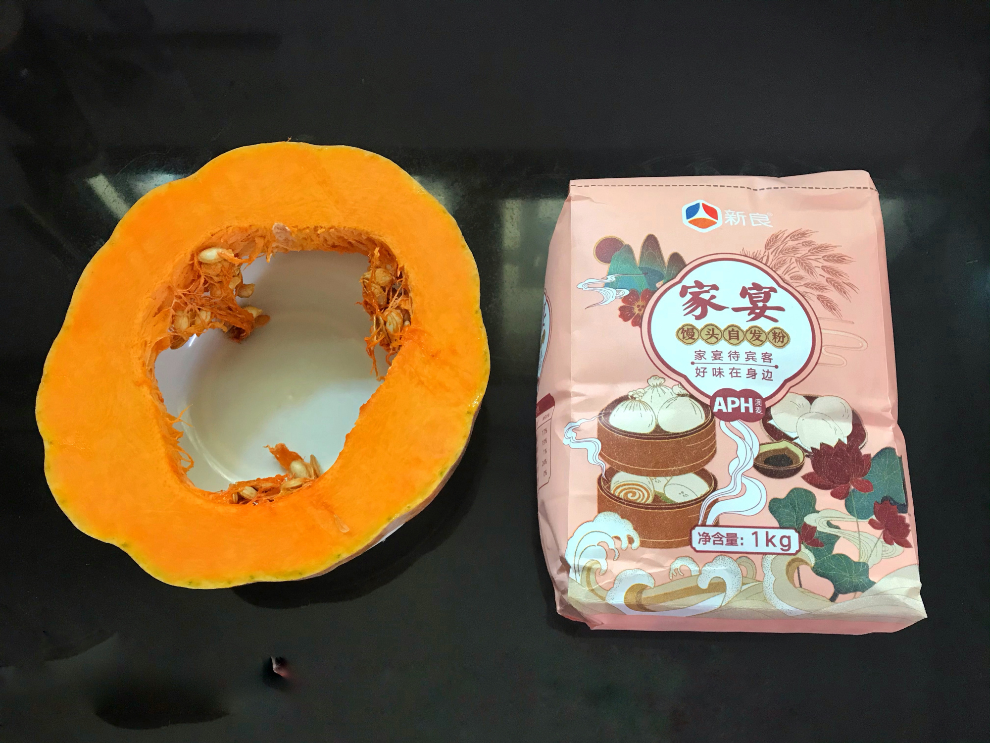 【做法】:1、准备好材料,自发粉300克,南瓜泥180克,这次用的自发粉直接加南瓜泥揉成面团就可以,不用再加酵母了。