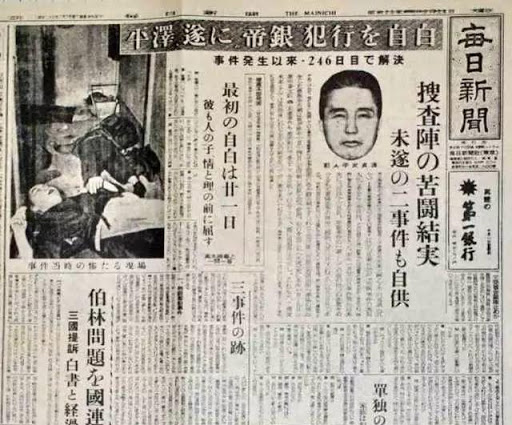 根據日本媒體「文春Online」報導,這起殺人案發生在1948年1月26日。當時,位於東京都豐島區椎名町的帝國銀行分行,在接近打烊的時刻前,突然進來壹位男子。該男子表示他是官方的某醫學博士,他說附近有人感染了痢疾,曾經來過銀行,因此他為了防止疫情擴大,到此負責發派藥物給大家。