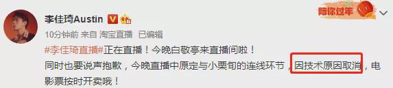 在23日當晚,李佳琦突然臨時在微博上發布消息稱原定於小栗旬的連線環節,因為技術原因取消。
