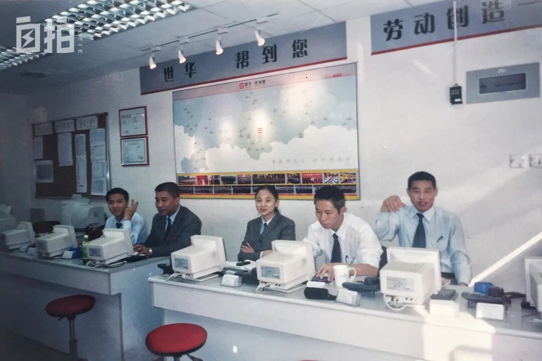 我(左壹)和同事們在門店工作的照片, 最開始沒有電腦,後來每人配了壹台。