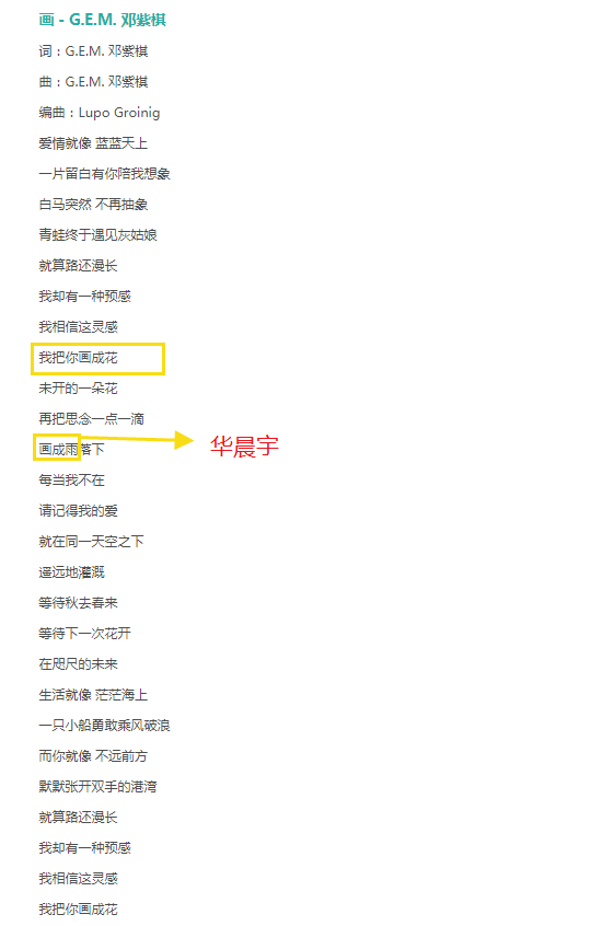 沒想到之後華晨宇被曝出和鄧紫棋有不同尋常的感情之後,我們才發現《畫》這首歌隱藏的蛛絲馬跡,歌詞裡面的“畫成雨”的諧音不就是“華晨宇”嗎?