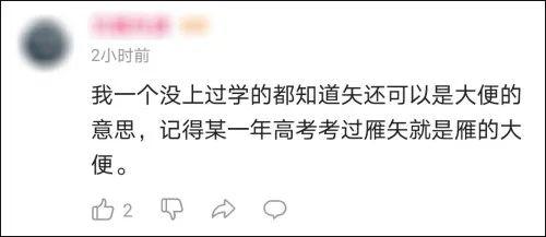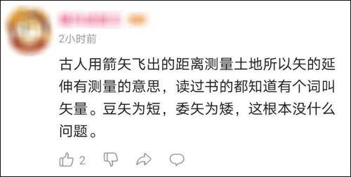 還有網友繼續幫忙補充。例如,因為通假," 矢 " 還有糞便的意思,《史記 · 廉頗藺相如列傳》中就有 " 雁矢 " 壹詞的出現;又如,古人用箭矢飛出的距離測量土地,所以 " 矢 " 延伸開後,還有測量的意思,所謂 " 豆矢為短,委矢為矮 " 說的就是這麼個情況。