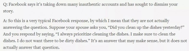 張回應道:這是壹個非常典型的Facebook式回應,但實際上他們並未回答問題。就像有壹天,你老公問你:“昨天你洗碗了嗎?”你回答:“放心,洗碗是我每天的第壹要務,我是不希望家裡有髒盤子的存在的。”這個回答聽起來是那麼回事,但實際上並沒有真正在回答此問題。
