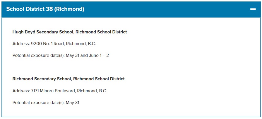 根據溫哥華沿岸衛生局(VCH)官網發布的消息,暴露新冠病毒的學校及日期