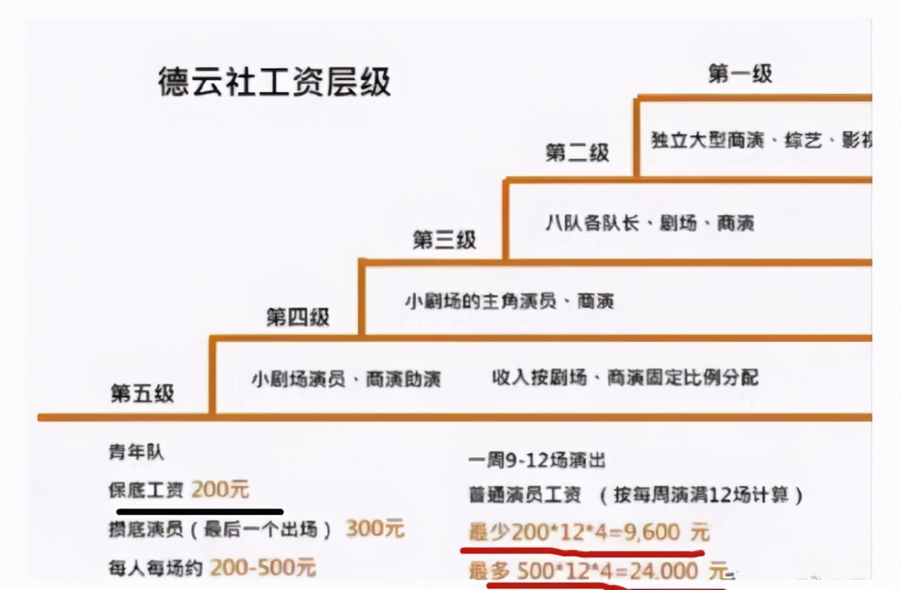 演出的节目不一样,收入也不一样,一般倒二和攒底拿得要多一些。而小剧场和德云社一般是2:8分账,剩余的八成再按照一定的比例分给小剧场演出的演员。每个人的收入等级是根据演出的顺序,能力以及知名度等按比例来分成,估计刚出来学徒一天就是200元左右。