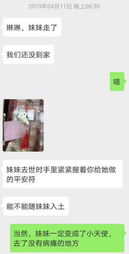 很遺憾,她還是沒能撐到家。晚上 6 點多,依然是子寅姐姐的微信,說她在路上去世了,手裡緊緊握著我送給她的平安符。