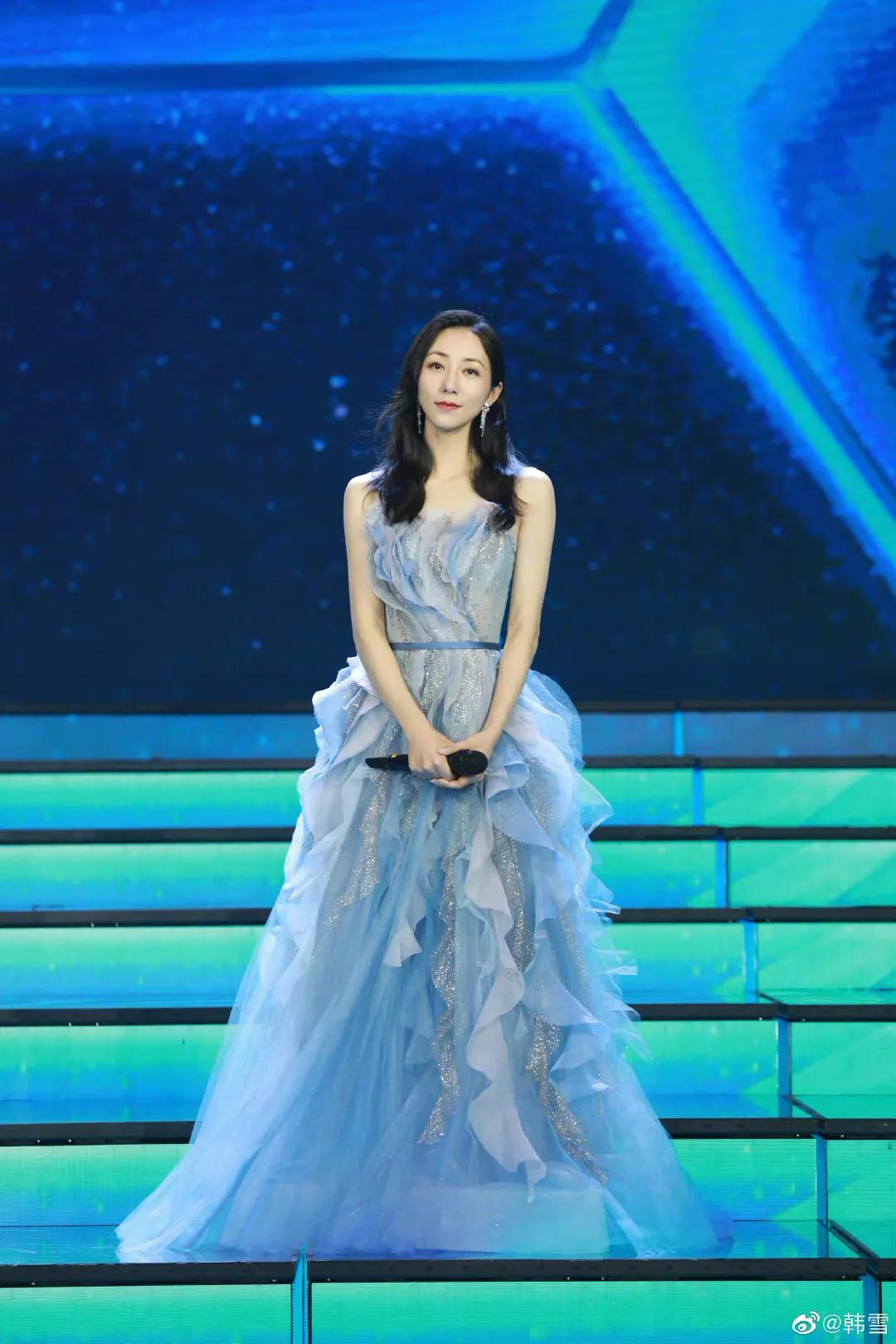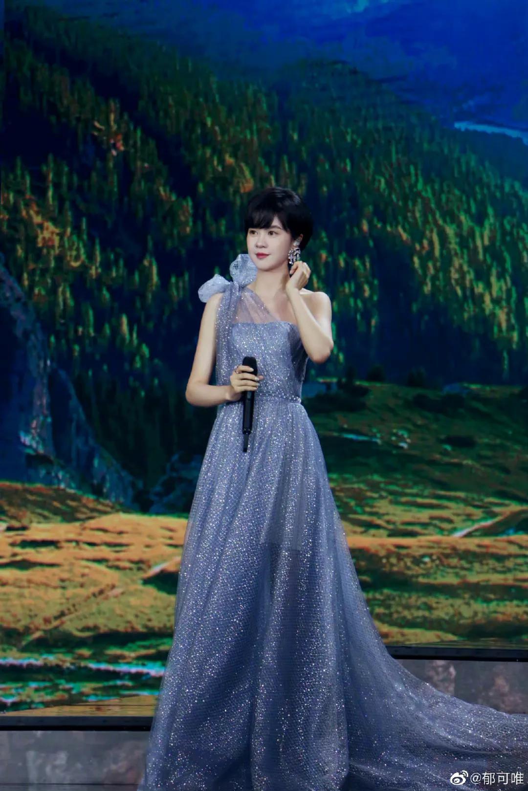 當然晚會造型可不止這壹種色系,其他女星的造型也拾分亮眼。郁可唯壹身淺藍色紗制長裙,鑲滿亮片,露出優秀的頸肩,盡顯身材。