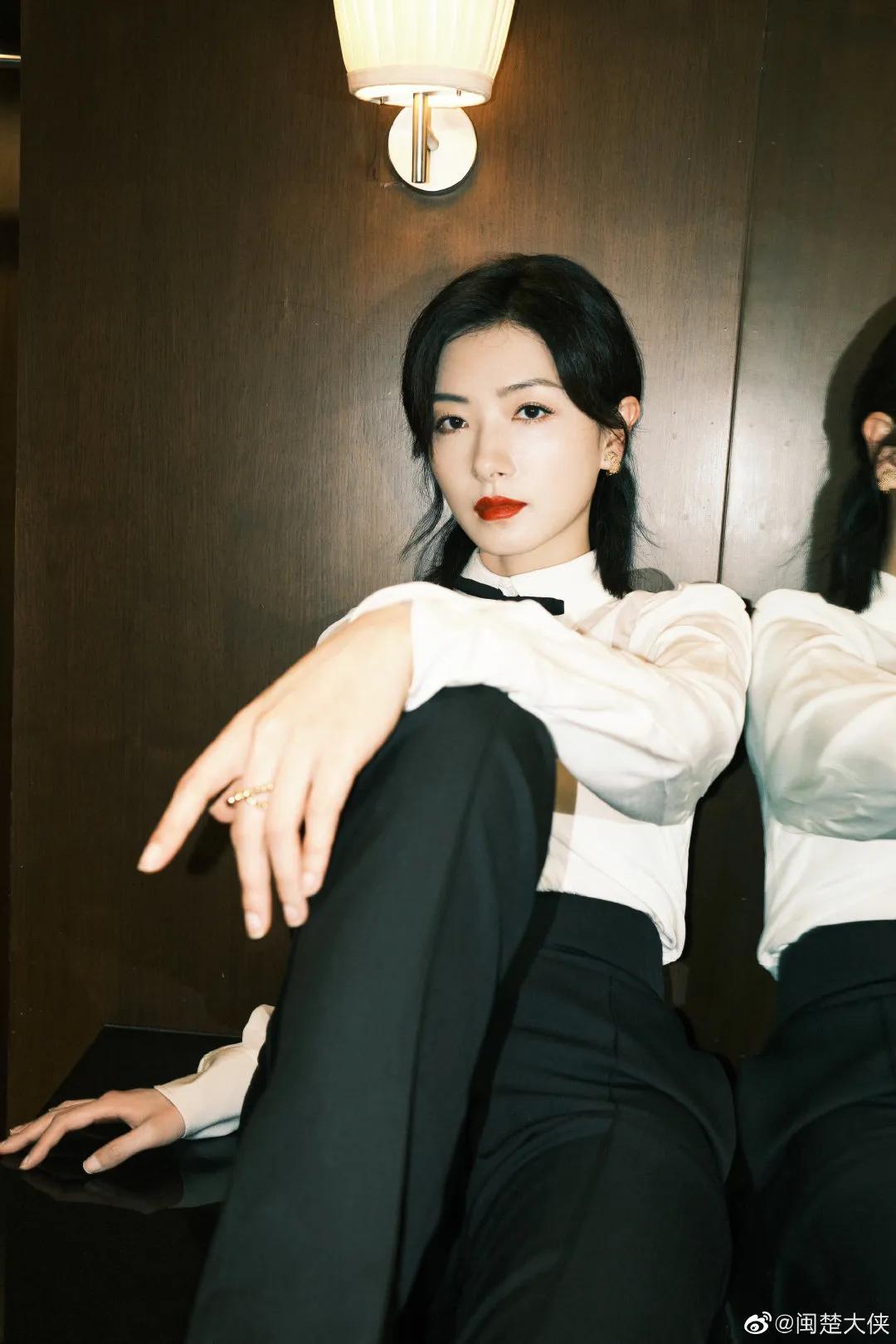 萬茜者是簡單的白襯衫加黑色蝴蝶結,配上黑色高腰西裝褲盡顯身材比例,簡約大氣,大方又不失優雅。