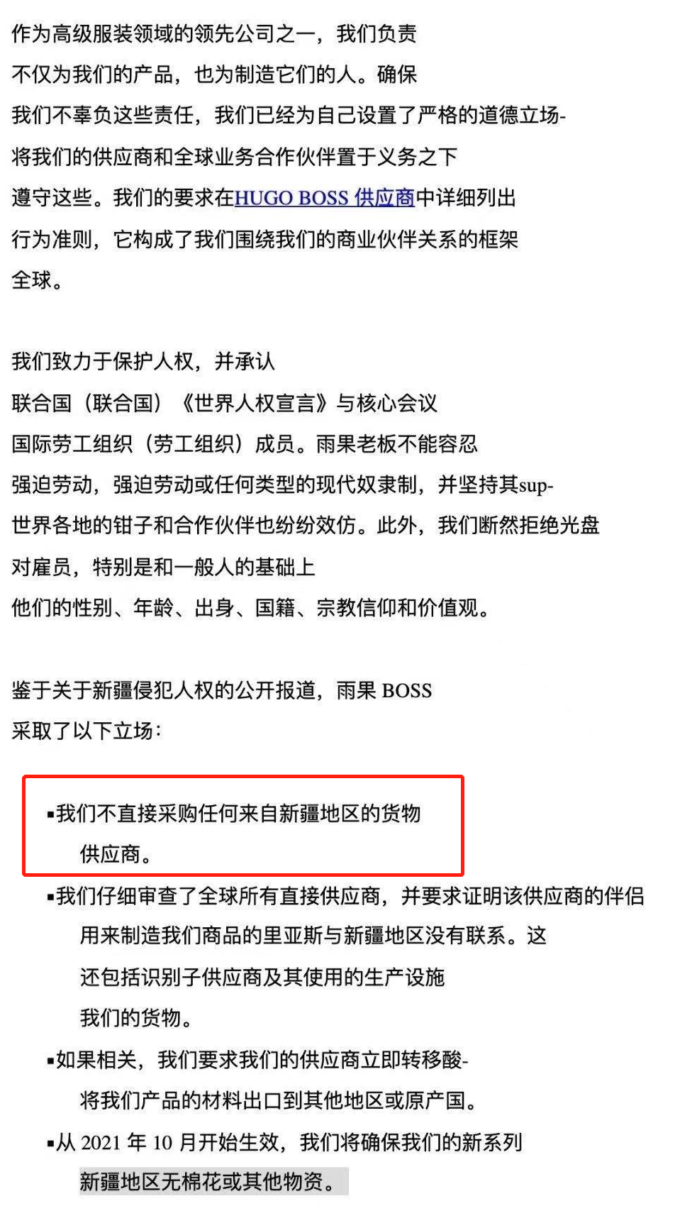 當時BOSS雨果的新疆棉聲明被扒是“國內特供”,甚至發出不久就被刪除;品牌在外網依舊寫著“不直接采購任何來自新疆地區的貨物”,隨後被扒出從未退出過BCI組織。