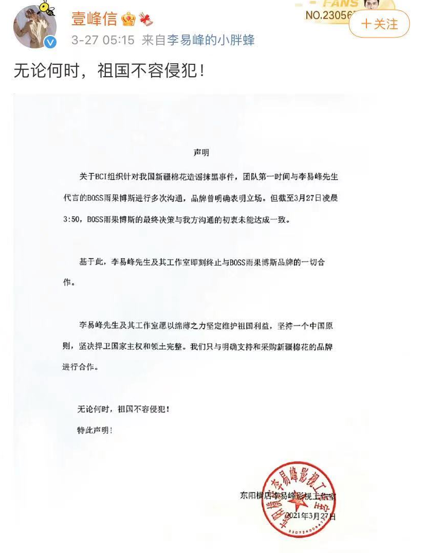 事發後,國內曾和該品牌有過緊密合作的男星:李易峰、王琳凱、朱正廷紛紛選擇解約,站出來表明立場。