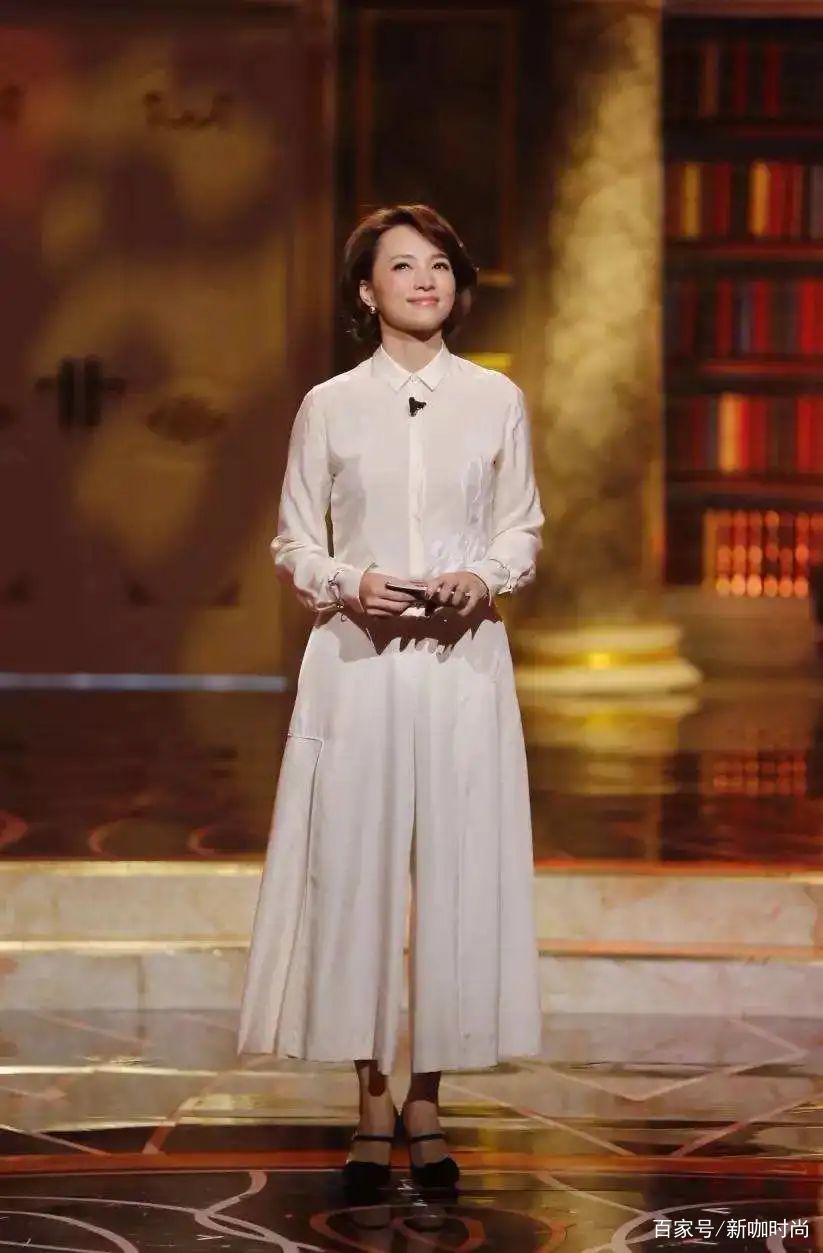 在我們的印象中,董卿壹直都是壹個非常大氣溫柔的女人,她的個人氣質從她的衣著造型中就能夠看得非常明顯。董卿身著壹件襯衫式連衣裙,這種素淨的色調和規整的版型感,能夠最大程度展現出壹個知性女人大氣的風度和儀態,而傘裙的樣式又不顯得過於樸素,甚至還能夠起到修飾身形的作用,如果想要更加精致優雅壹些,也可以在領口搭上領結,減齡的作用也很好。