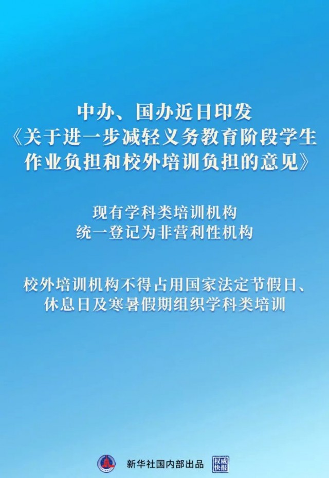 近日,中办、国办印发《关于进一步减轻义务教育阶段学生作业负担和校外培训负担的意见》