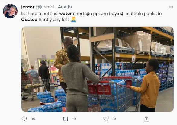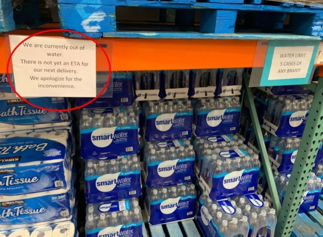 就在上个月,一位Reddit用户在Costco拍下了一张照片,上面写着:“目前我们的瓶装水短缺,下一次交货时间还无法预计,我们为给您带来的不便表示歉意。”