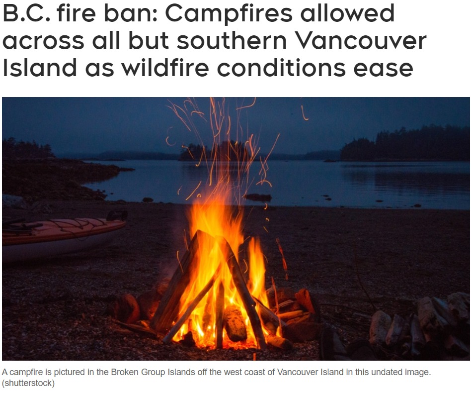 本月早些时候,沿海消防中心允许营火,其宽度不得超过半米,高不得超过半米,但在温哥华岛南部三分之一和海湾群岛仍被禁止营火。
