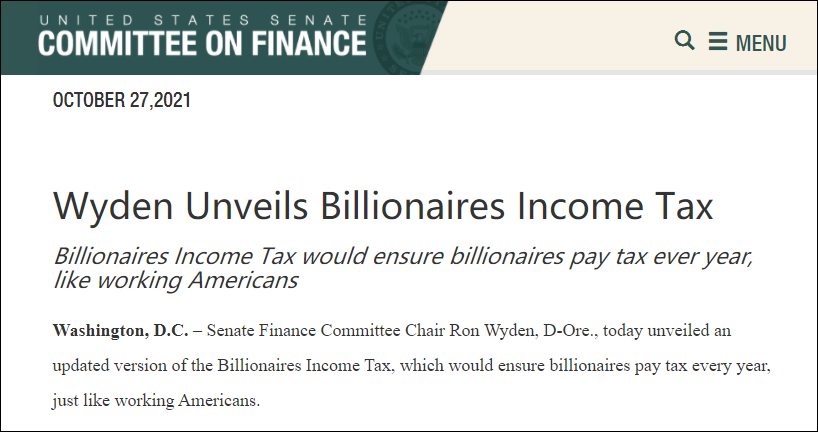 当地时间10月27日,美国参议院财政委员会主席罗恩·怀登(Ron Wyden)公布一项税收提案,称将征收“亿万富翁所得税(Billionaires Income Tax)”,用以支付拜登政府扩大社会保障和应对气候变化的费用。