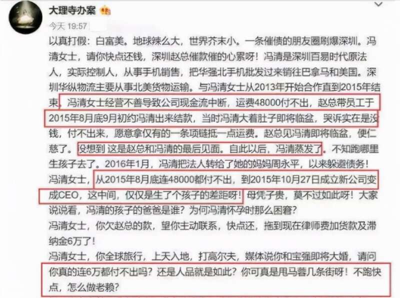 他發文聲討馮清,表示馮清名下的公司至今都還拖欠深圳某位老板4.8萬的物流費用。