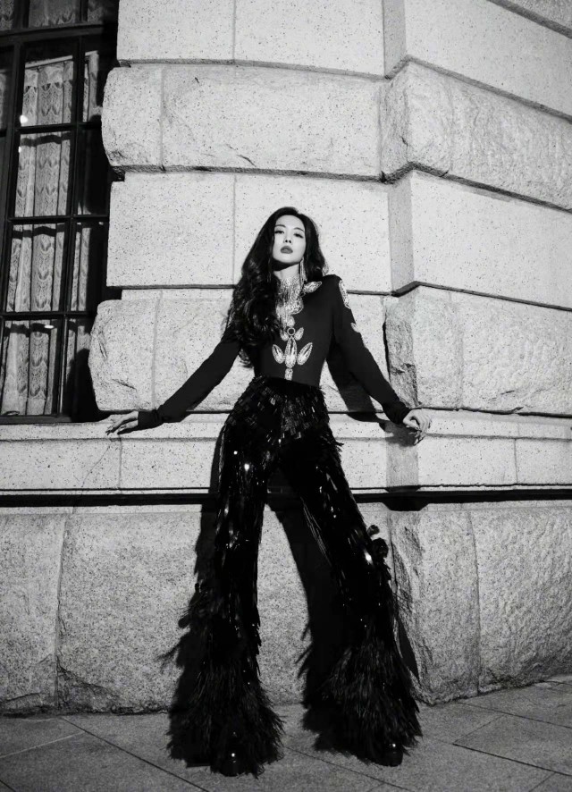 身為唱跳歌手的王霏霏為了方便表演選擇了褲裝,緊身黑色上衣勾勒出她完美的身材,側腰開洞的設計也很有“小心機”,下半身搭配的黑色亮片闊腿褲也很吸睛,跳起舞來每壹幀都很美。