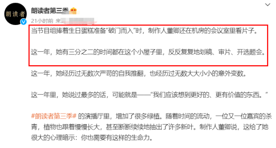 在這間小小的會議室,承載了董卿過去壹年的大部分時光。在朗讀者的配文中提到,她有叁分之贰的時間都在這個小屋子裡,反反復復地劃稿、審片、開選題會。當節目組捧著生日蛋糕准備“破門而入”時,制作人董卿還在機房的會議室裡看片子。其非同壹般的敬業,只是為了呈現更好的作品。