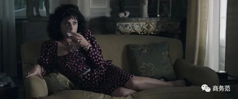 像這種通體印花的著裝,電影中也出現了不少。Gaga在影片中還穿了壹件YSL波點裙裝,復古波普風,符合貴婦人設。