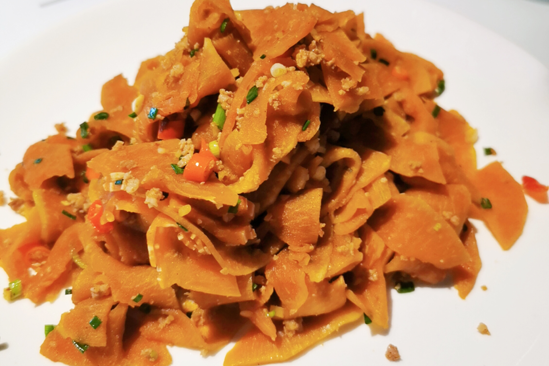茄子干的味道,以甜辣着称,辣中带着甜,甜中有辣,相当的有嚼劲,所以当你吃过一次以后,就会想着什么时候再吃一次。