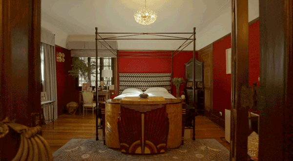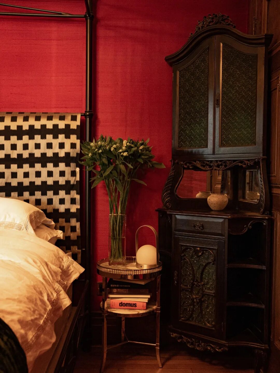 臥室原本是非常暗的,但對於睡眠是有幫助的,特別是早上,不會被強烈的光線照醒,所以我還是讓它暗壹些,選用了壹個酒紅色的絲絨壁紙去做壹個裝飾。”