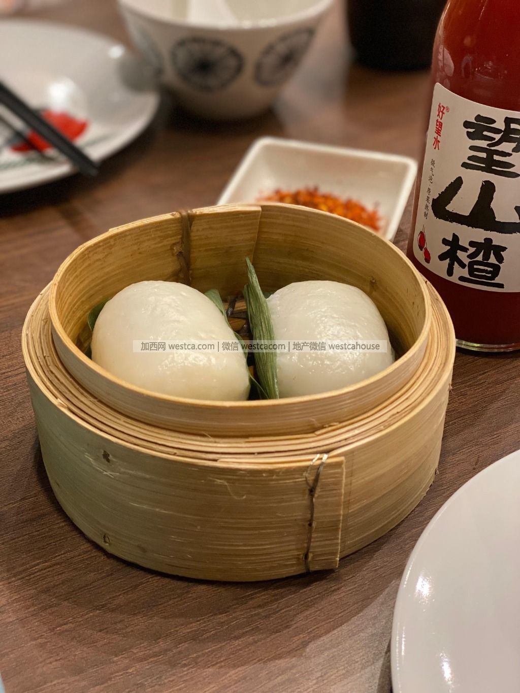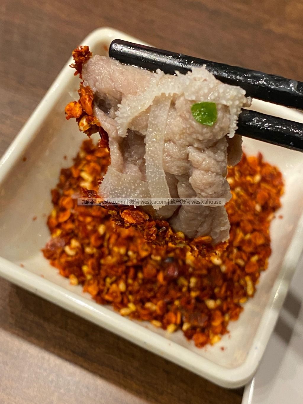 鍋裡的食材蘸著幹辣椒蘸碟吃,個人覺得蘸碟調的不夠香,辣椒碎太硬,而且有點兒鹹。