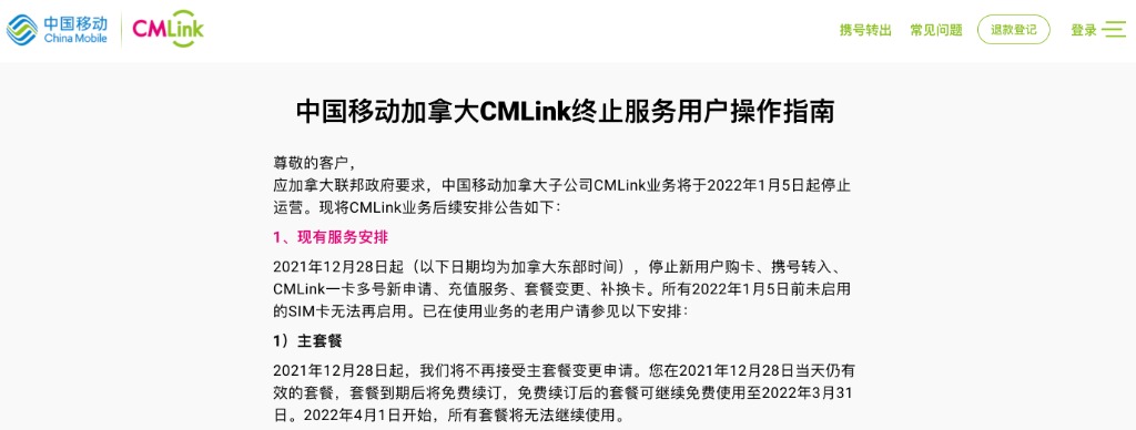 該公司網站上的壹份聲明說:“應加拿大聯邦政府的要求,中國移動在加拿大的子公司CMLink將於2022年1月5日停止運營。”