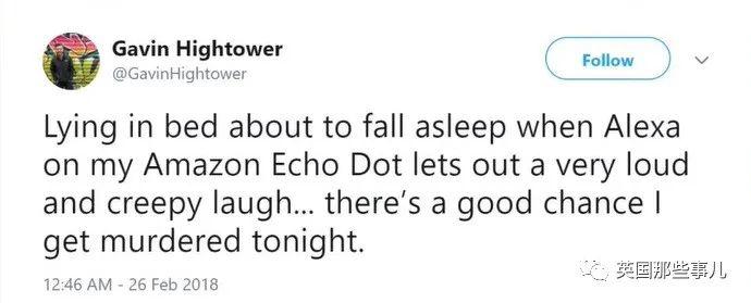 " 我躺在床上,差不多要睡着了,Alexa 突然发出非常响、非常邪的笑声 …… 我今晚大概是要被谋杀了吧。"