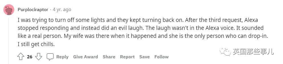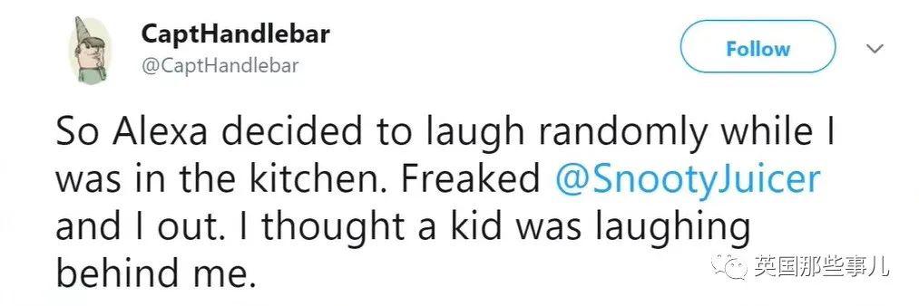 " 我在厨房的时候,Alexa 莫名发出笑声,把我和我朋友都吓坏了。我还以为是有个小孩在我背后笑。"