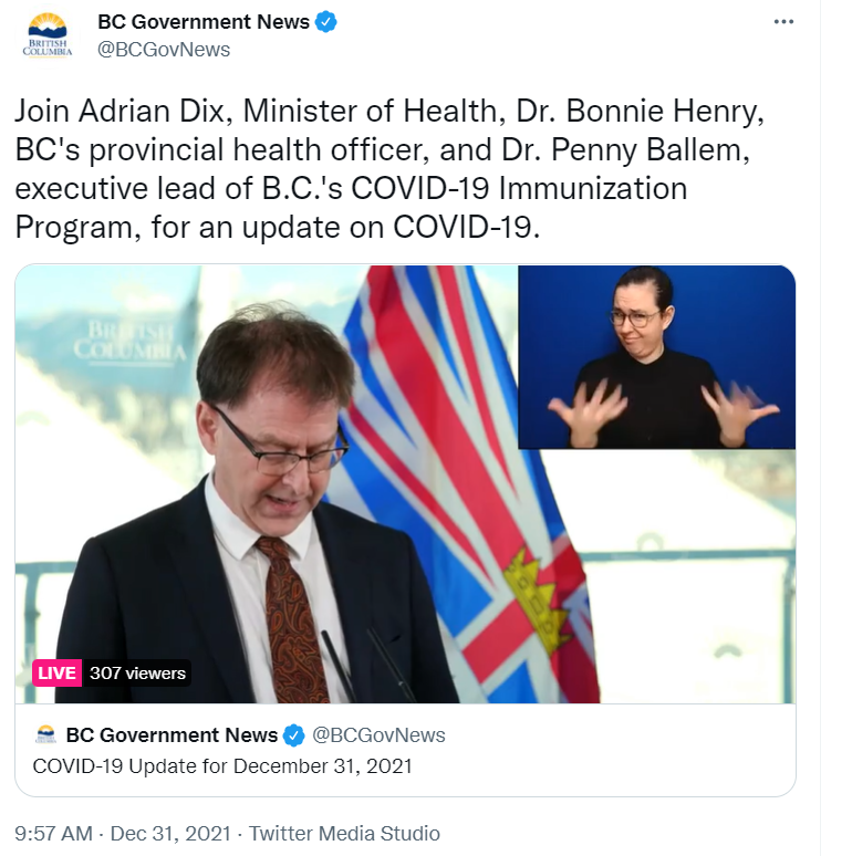 2021年12月31日上午10點,BC省衛生部長Adrian Dix、BC 省衛生官員Bonnie Henry博士和BC省 COVID-19 免疫計劃執行負責人 Penny Ballem 博士壹起發布本年度最後壹次疫情通報。