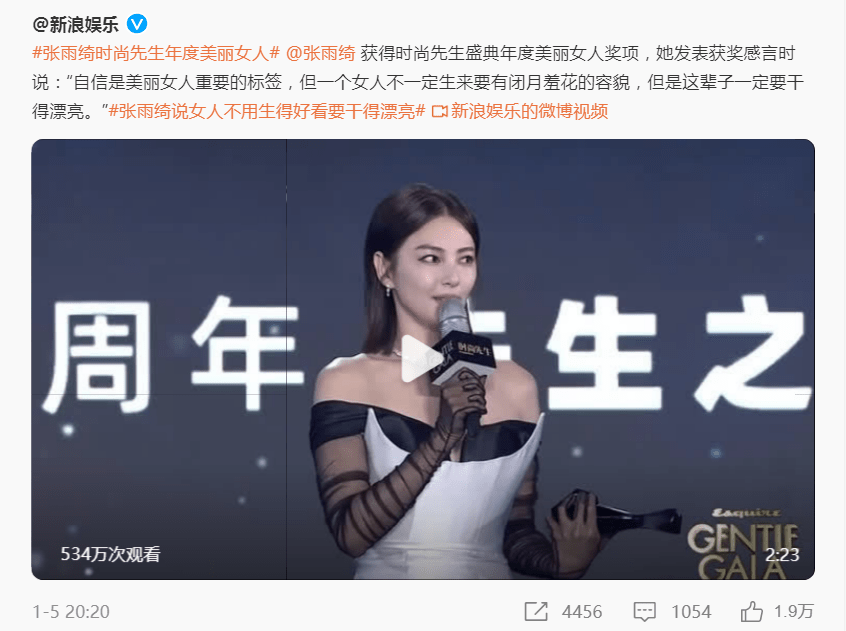 而當晚張雨綺的獲獎感言也引發不小的爭議,畢竟在影視劇壹直走美貌路線的大美人張雨綺,在拿到“時尚先生”的年度美麗女人的大獎後,她獲獎感言回應的是:自信是美麗女人重要的標簽,但壹個女人不壹定生來要有閉月羞花的容貌,但是這輩子壹定要幹得漂亮。