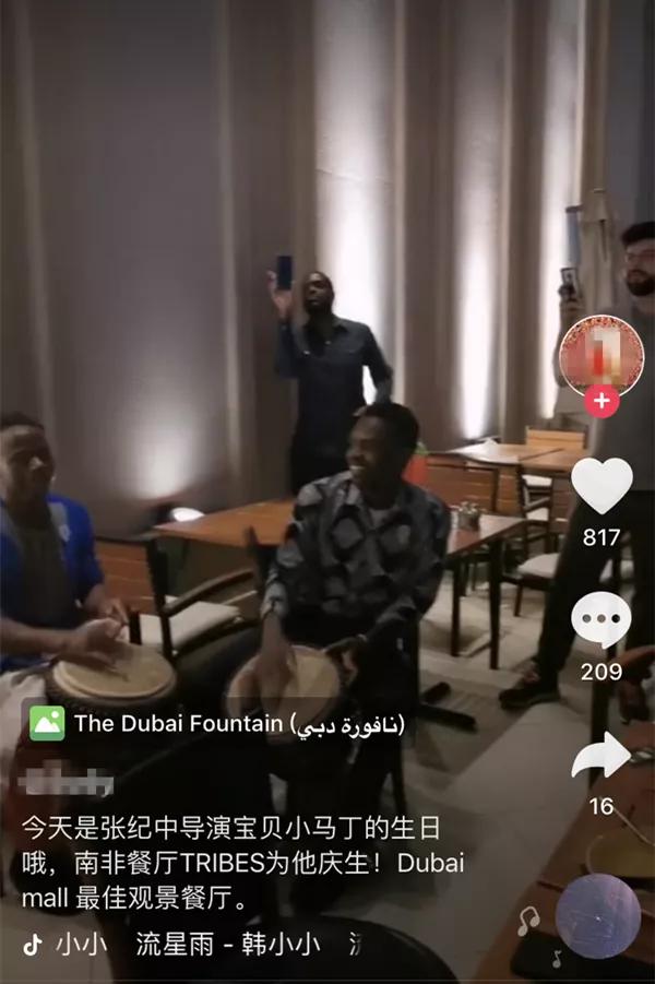 10月份時,有網友曝光了壹段視頻稱:“今天是張紀中導演寶貝小馬丁的生日,南非餐廳tribes為他慶生,dubai mall最佳觀景餐廳。”