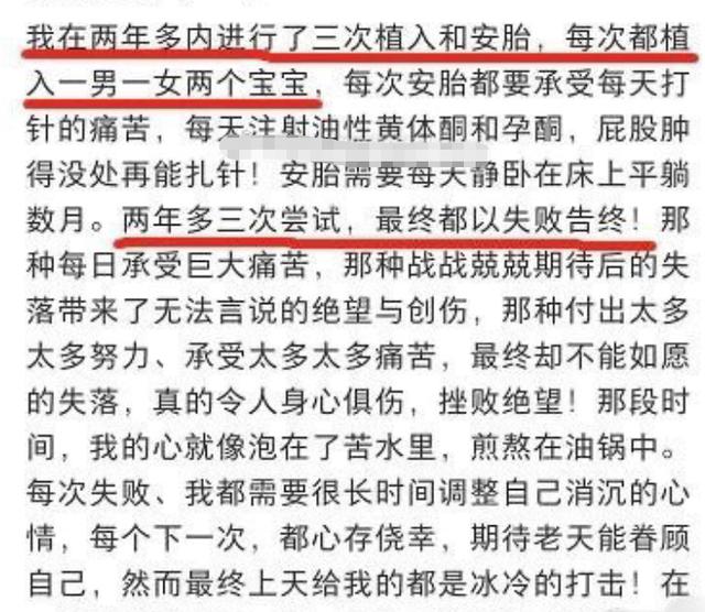 杜星霖曾經在兩年多的時間內進行了叁次試管嬰兒,每次都植入壹男壹女兩個寶寶,在做試管嬰兒期間要承受著打針的痛苦且不能隨意亂動,只能靜躺,但最終都以失敗告終。