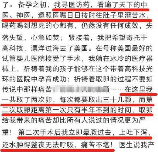 她稱在備孕時每天按時往肚子裡“灌苦水”,取卵過程也拾分痛苦。第贰次取卵手術結束後直接昏厥,上吐下瀉。甚至水腫得整夜無法呼吸。
