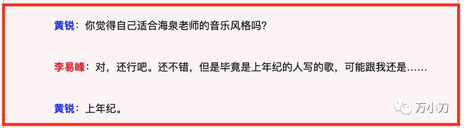 當有記者問他如何評價老板胡海泉的《肆葉草》時,他本想開句玩笑調侃壹下,說" 還不錯,但是畢竟是上年紀的人寫的歌,可能跟我還是 ……"