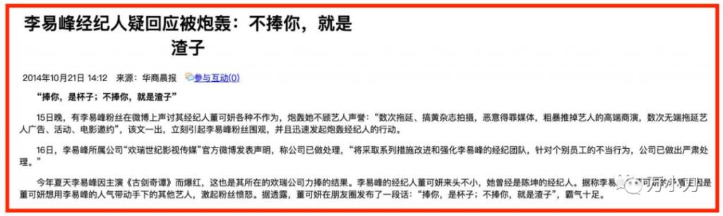 李易峰在《古劍奇譚》爆紅後,董可妍壹直想利用李易峰的人氣帶公司新人。本來帶新人無可厚非,但董可妍的做法有點激進,壹來贰去,激怒了李易峰的粉絲。