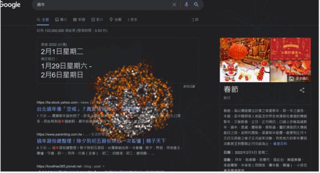 记者实测,透过 Google 搜寻“过年”、“春节”、“除夕”、“新春”、“年节”等关键字,画面会开始放烟火,绽放可爱的虎年图样,相当有年节氛围。比较可惜的是,输入“虎年”不会触发,得用英文的“Year of the Tiger”才会启动彩蛋。