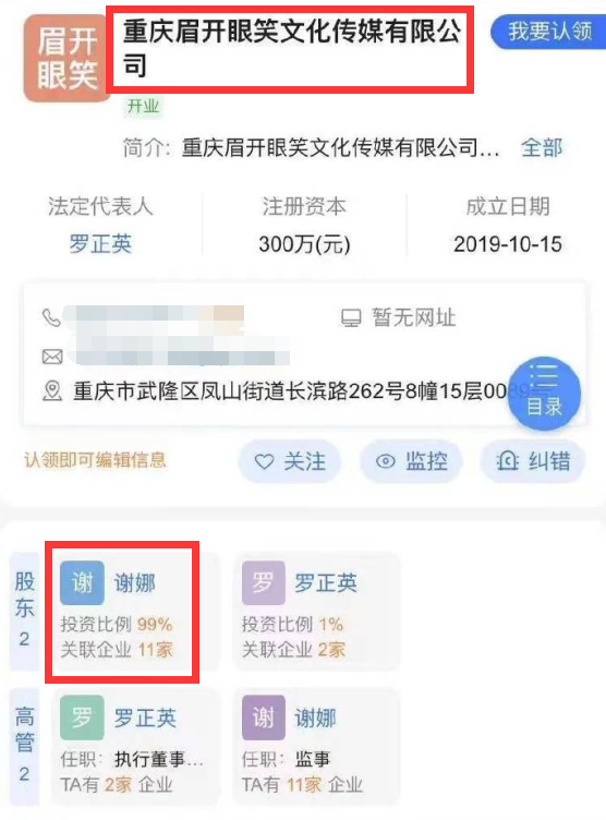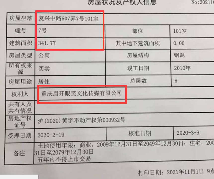 根據記錄顯示,這套房源早於2019年12月14日正式網簽,成交價格為5920萬元,在相關登記信息中標識著,這套房源的權利人是重慶眉開眼笑文化傳媒公司,即謝娜的名下公司。