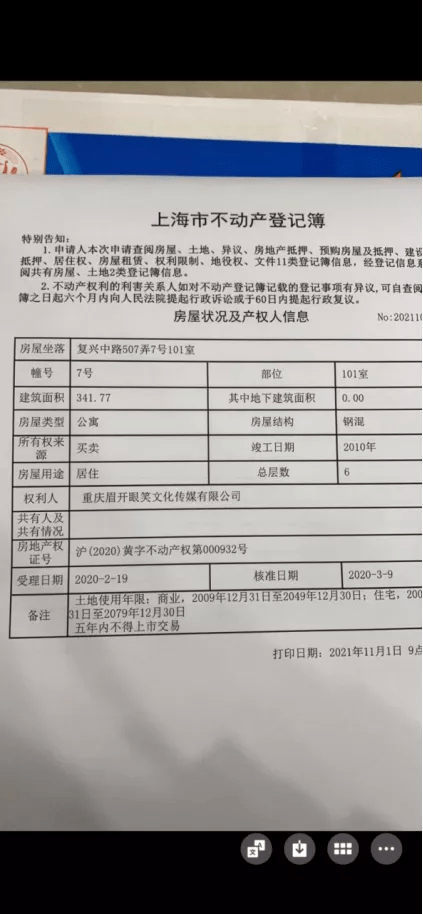 根據提供的上海市不動產登記簿中,顯示長文中所提到的地址,權利人是謝娜投資的重慶眉開眼笑文化傳媒有限公司。