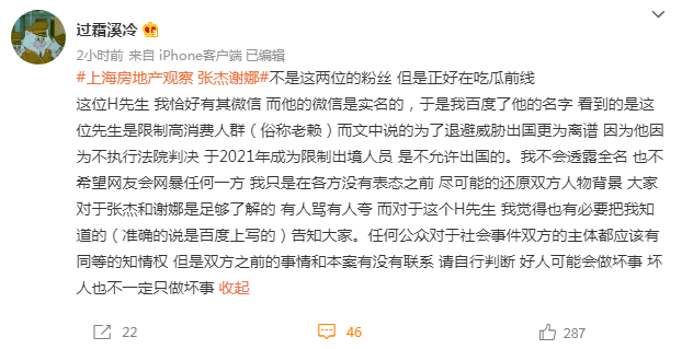2月7日下午,有房產中介委托好友發文,公開指責謝娜、張傑跳單,表示自己身在國外感染新冠,且症狀嚴重,不在乎被粉絲攻擊。