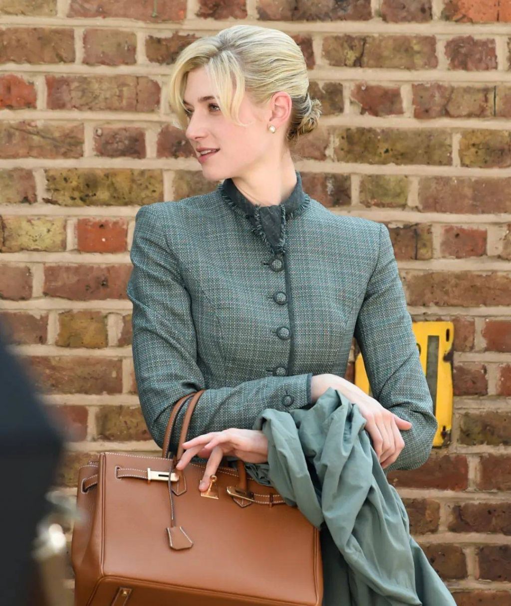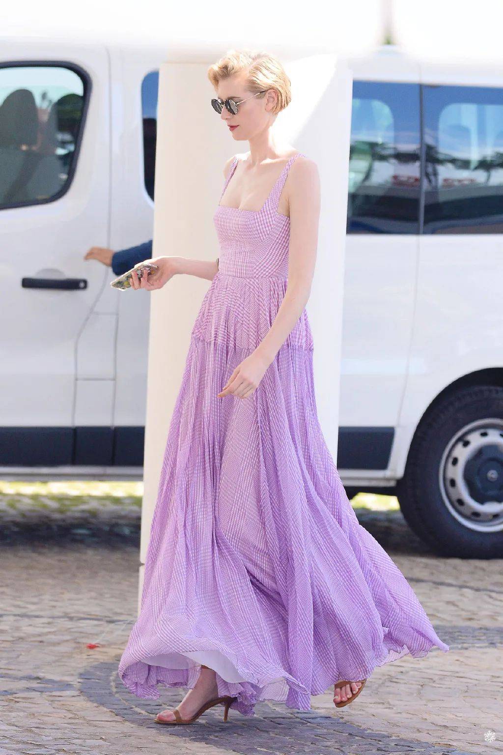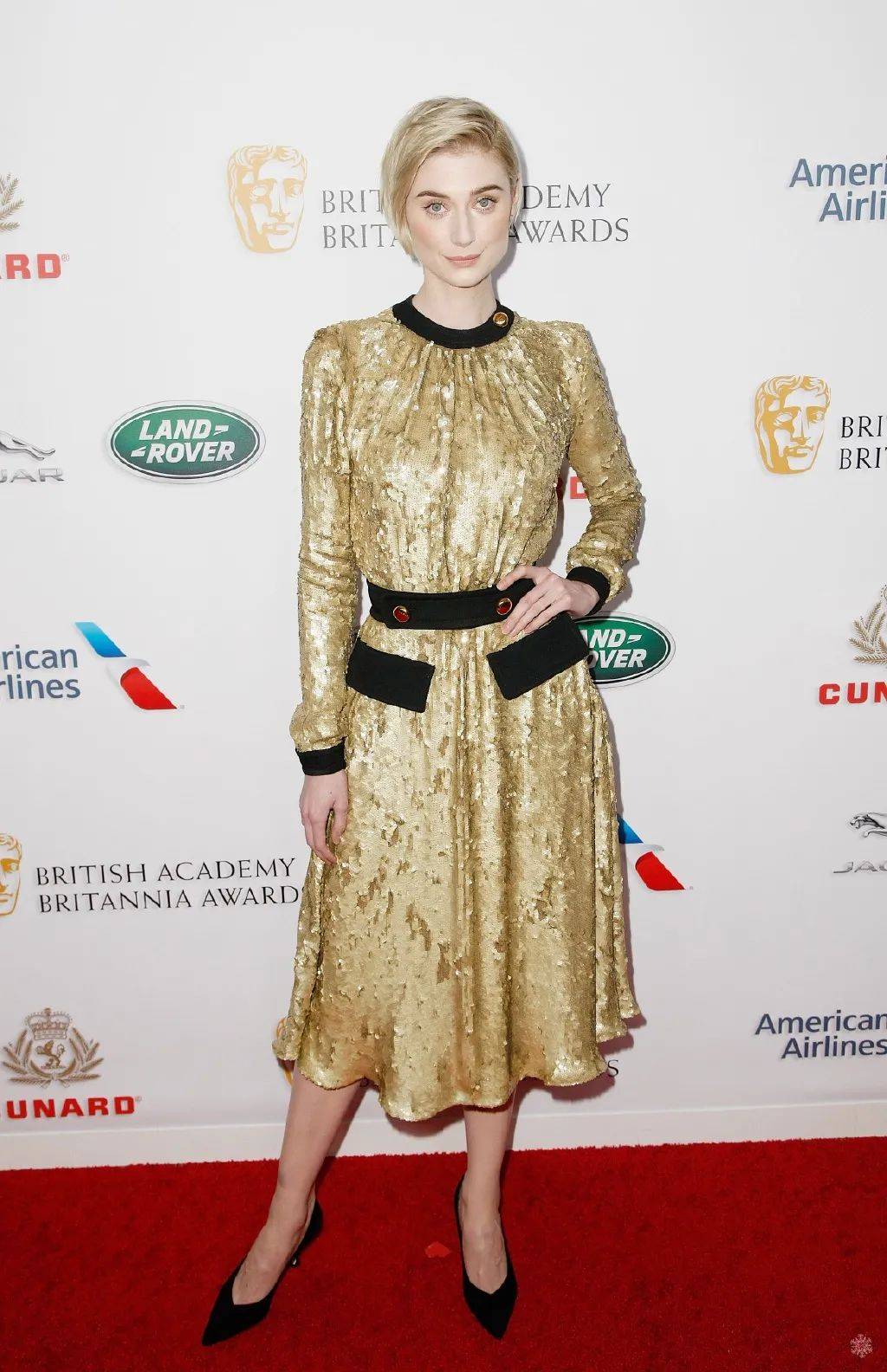 高妹Elizabeth Debicki的這件裙裝被改成了長版,要說這拿手包的動作和低頭淺笑的側臉,也真是完美還原了戴妃當年那種帶著點害羞的優雅。
