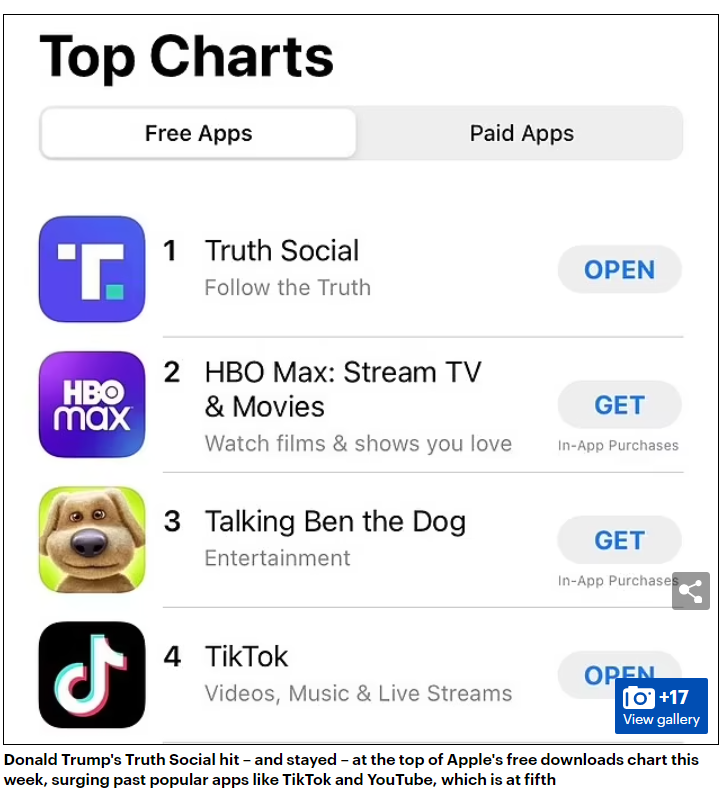 特朗普的最新社交平台 Truth Social 一经推出,立刻位列 Apple App Store下载榜榜首,吸引了大约 500,000 用户。