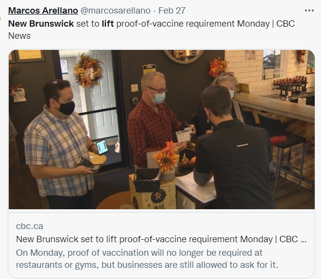 昨天2月28日周壹生效,P.E.I. 停止使用疫苗護照,並取消對未接種疫苗的旅行者的隔離要求。