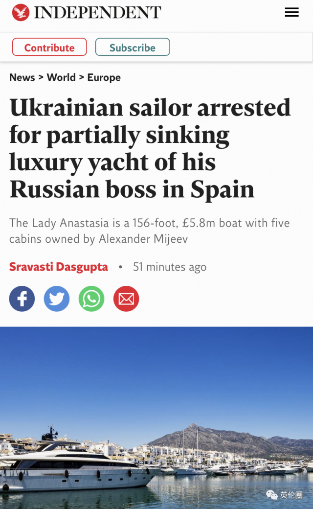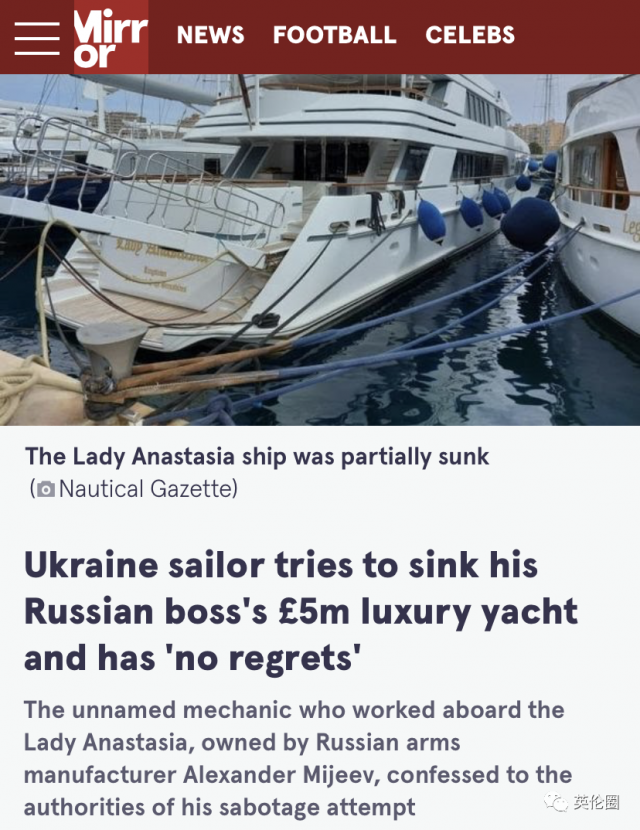 就在最近,各大英媒紛紛報道了壹位烏克蘭機械師的驚人舉動:每日郵報:“我還會再做壹次”:反叛的烏克蘭機械師因‘故意沉沒’俄羅斯老板價值500萬英鎊的游艇而被逮捕,理由是老板為普京制造武器