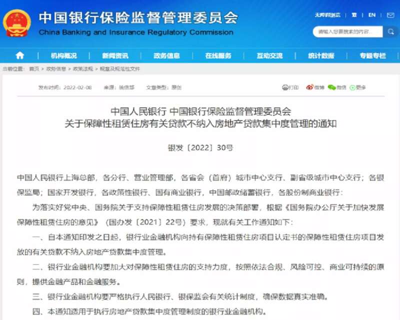 2月8日,中國人民銀行、中國銀行保險監督管理委員會兩部委聯合發布了《關於保障性租賃住房有關貸款不納入房地產貸款集中度管理的通知》,對保障房的房貸部分剔出銀行監管紅線范圍中。