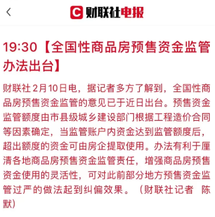 3天後,真正令房企興奮的來了。全國性商品房預售資金監管辦法出台。