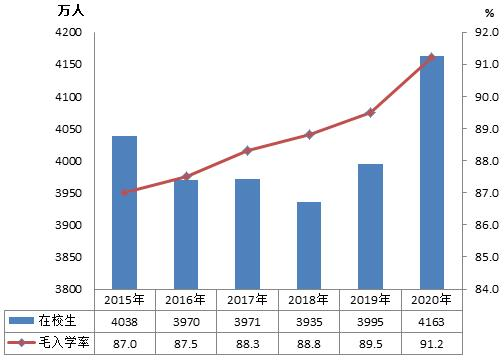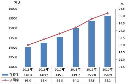 2020年,小學、初中義務教育的孩子,也逐年穩步上升到1.56億。