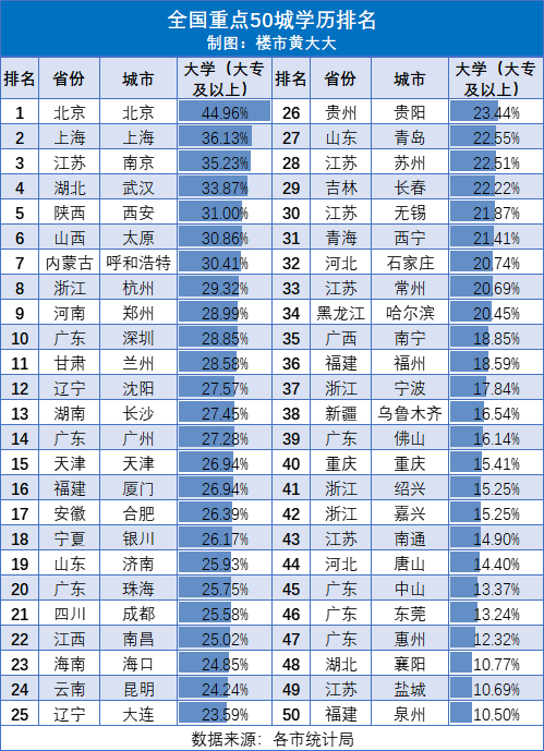 據樓市黃大大統計,全國重點50城中,北京、上海、南京、武漢、西安和太原等中心城市,人口結構中有超30%是大學以上學歷。