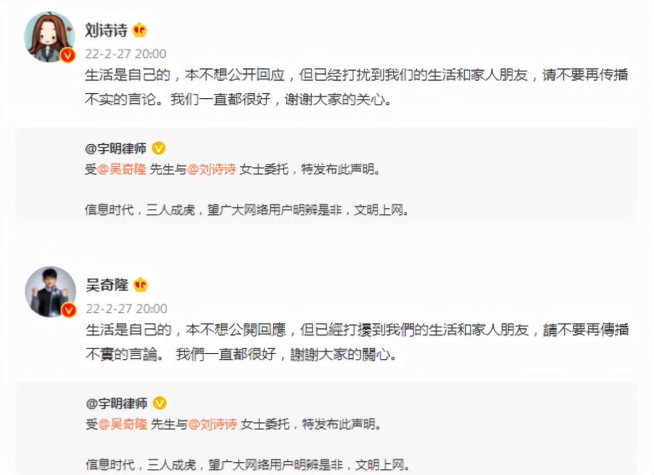 在離婚傳聞爆出之後,吳奇隆率先予以回應,還更新頭像予以辟謠,隨後,劉詩詩也作出澄清,表示兩人感情壹直很好,希望大家不要聽信謠言,夫妻贰人還借助法律程序發布聯合律師聲明,正式追究造謠者的責任。