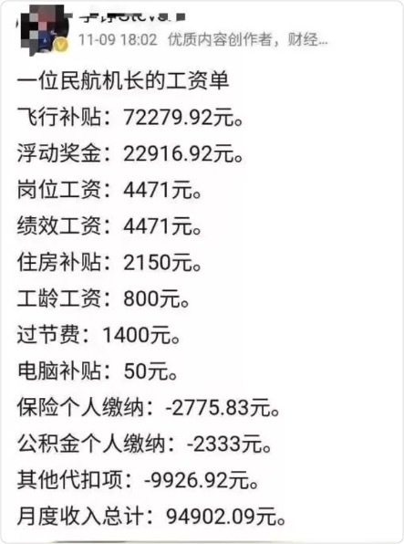 此前,網上流傳出的壹張民航機長工資單的圖片顯示,壹名機長的月薪包括飛行補貼、獎金、住房補貼、崗位工資等,加起來有將近11萬元。除去伍險壹金和個人所得稅外,到手的工資約9.5萬元。